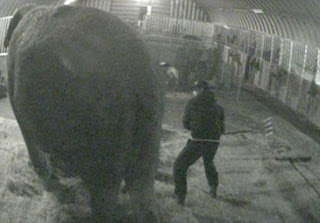 In goes the pitchfork: The weapon is used to beat the animal and even to stab her in the head. The graphic attacks were recorded over three-and-a-half weeks by a surveillance camera concealed on a farm in Polebrook, Northamptonshire during the circus's winter break