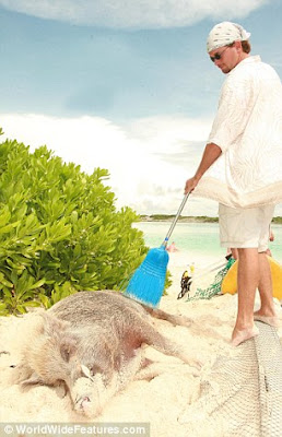 The 12-year-old tamed boar spends his days strolling on the beach and taking a swim in the waves - although he has to be careful not to get in the way of predatory sharks which also cruise the island.
