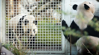 Getting to know each other: Male Yang Guang, left, gazes longingly at Tian Tain from his enclosure in Edinburgh Zoo